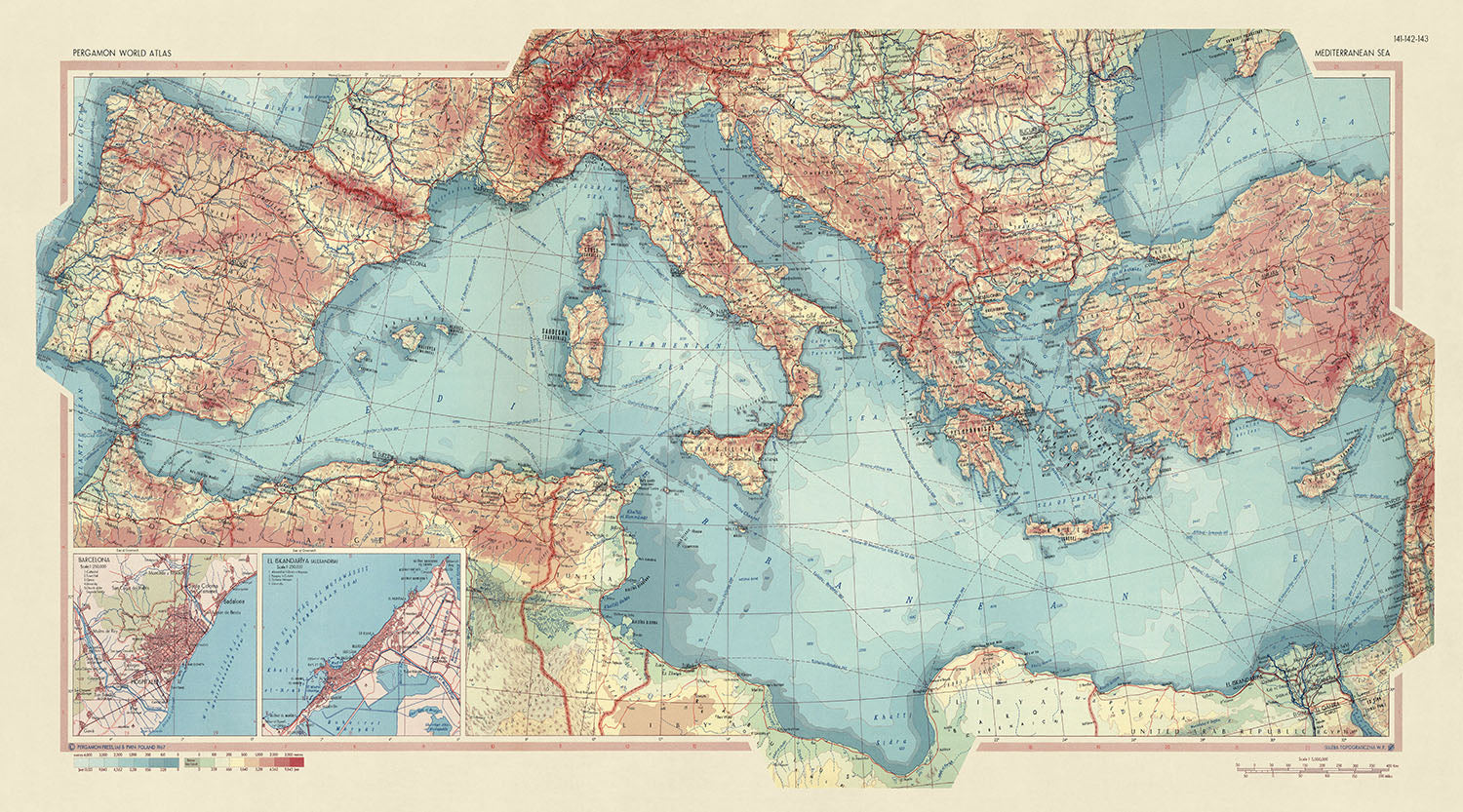El mapa extiende su alcance desde Tel Aviv y Chipre en el este hasta Berna y Ginebra en el norte, y desde Budapest y Bucarest en el noreste hasta las regiones costeras del norte de África. Es un festín visual de diversidad geográfica, con cada región representada con meticuloso detalle. Los recuadros de Barcelona y El Iskandariya (Alejandría) ofrecen una mirada íntima a estas ciudades, destacando su importancia en la región mediterránea.