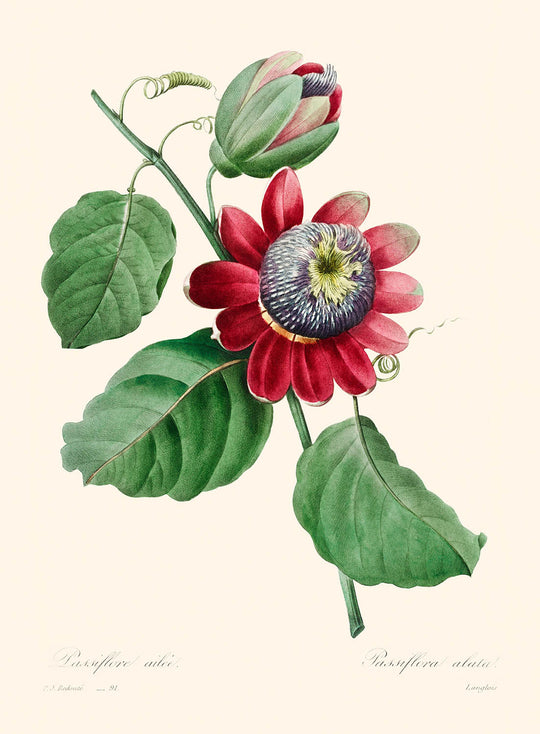 "Passiflore Ailee" se destaca no solo por su precisión botánica, sino también por su composición artística. El uso del color y el detalle por parte de Redouté da vida a la flor de la pasión, haciéndola parecer casi tridimensional. La interacción de luz y sombra, junto con los delicados gradientes de los pétalos, muestra el talento excepcional de Redouté y su pasión por el arte botánico. Esta pieza no es solo una ilustración científica; es una obra de arte que captura la belleza y la elegancia de la naturaleza.