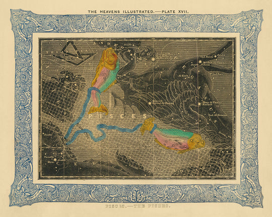 Publicada por primera vez en 1837, Piscis, Los Peces es un raro y cautivador mapa estelar coloreado a mano por Duncan Bradford. Este mapa celestial muestra la constelación de Piscis en impresionante detalle, proporcionando una visión perspicaz de la artesanía astronómica del siglo XIX. Originalmente apareció en Las Maravillas de los Cielos, una obra astronómica integral publicada en Boston ese año.