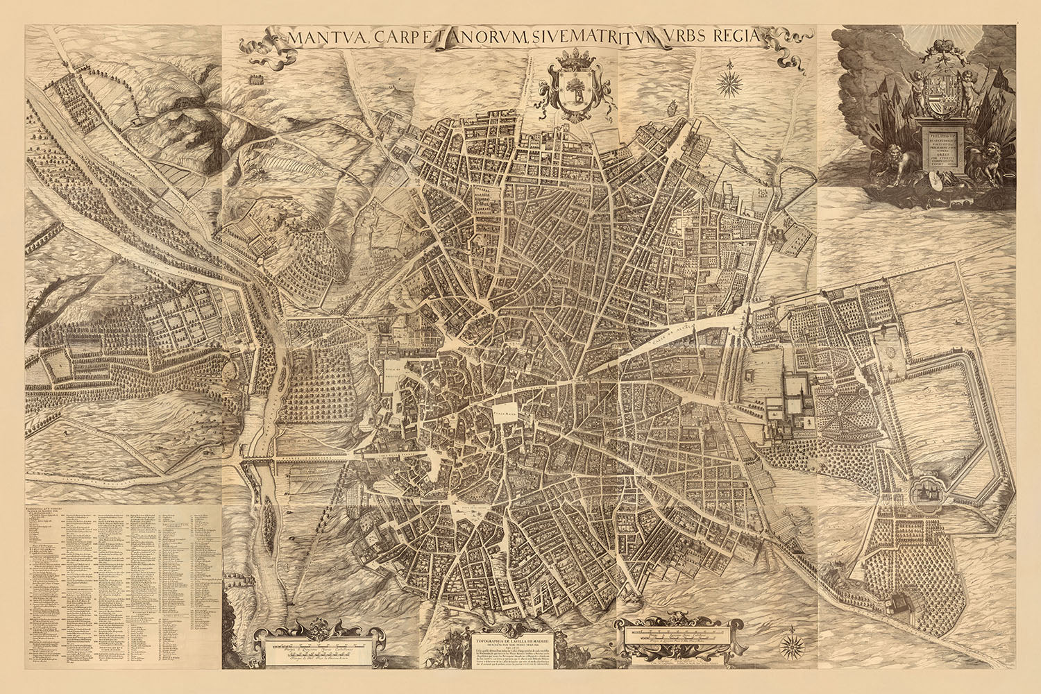 - El mapa incluye elementos artísticos como escudos y cartelas decorativas.