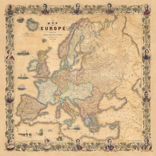 Mapa antiguo raro de Europa por Ensign, Bridgman & Fanning, 1855: Retratos de Victoria, Isabel, Napoleón, etc.