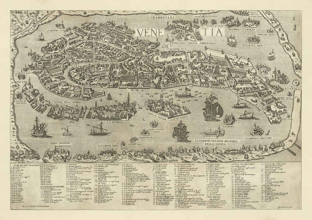 Mapa antiguo raro de Venecia, 1570 por Claudio Duchetti: San Giorgio Maggiore, Giudecca, Gran Canal, barcos mercantes