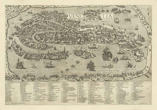 Este mapa monocromático de Venecia muestra cómo habría lucido La Ciudad Flotante hace 450 años. Conocida hoy por sus paseos en góndola, hermosos puentes y celebraciones de carnaval, en aquel entonces, Venecia era una ruta comercial clave desde el Medio Oriente hacia el resto de Europa.