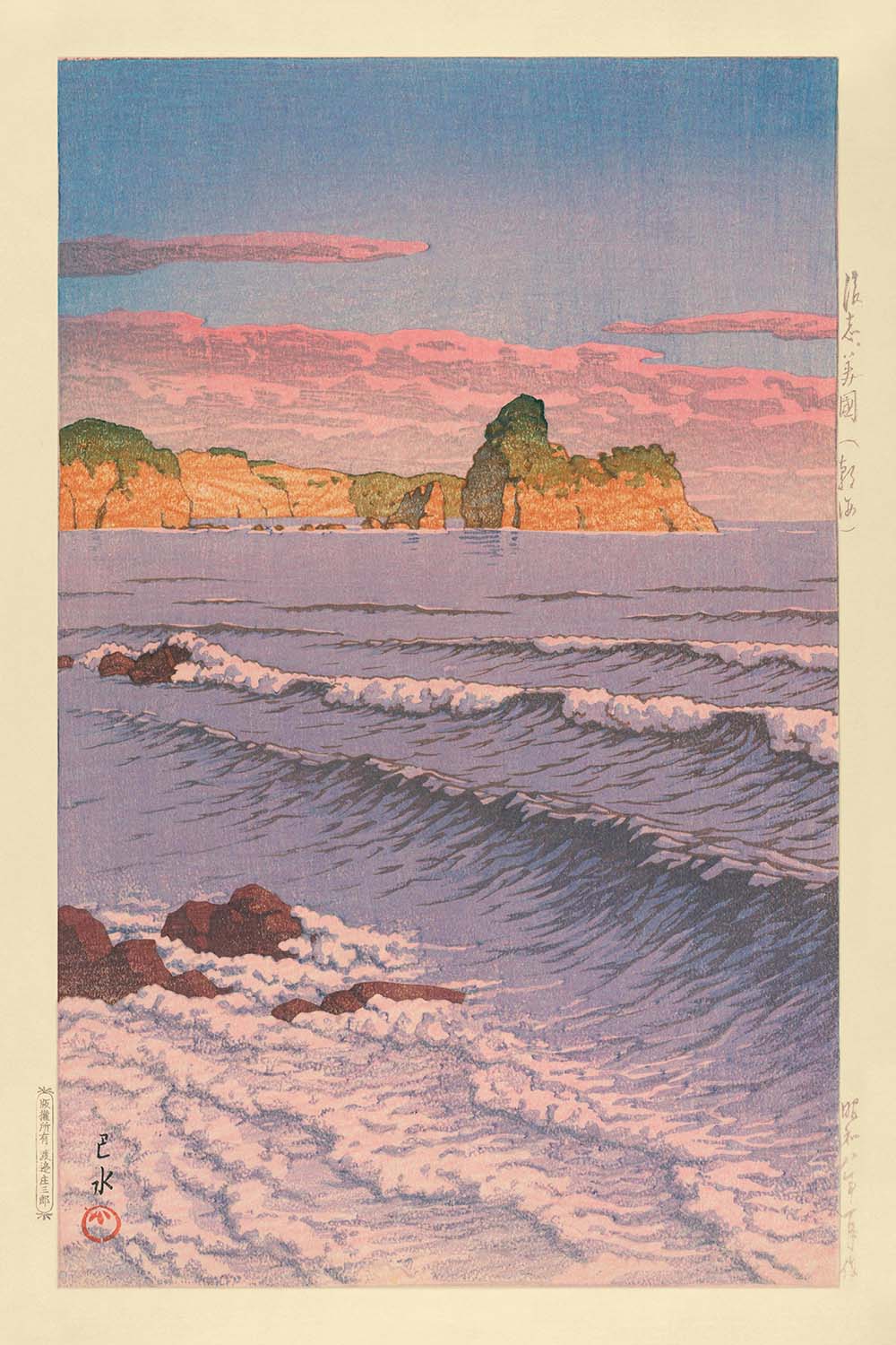 Lo que distingue esta obra de arte es el sublime uso del color por parte de Kawase. Dominada por suaves morados complementados por delicados rosas, la composición transmite un delicado equilibrio entre la serenidad y el movimiento, invitando a los espectadores a una experiencia contemplativa. Las olas magistralmente representadas, fluidas pero estructuradas, proporcionan un punto focal hipnotizante, el tipo de atractivo artístico que hace que esta impresión no solo sea un festín visual, sino una adición atemporal a cualquier colección.