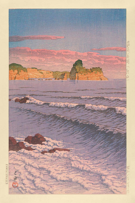 "Shinbeshi Bikuni Ocean Waves" de Hasui Kawase es una impresionante impresión en madera creada en 1935, que representa la excepcional técnica del maestro para capturar la belleza de la naturaleza. Hasui Kawase fue una figura célebre en el movimiento Shin Hanga, conocido por sus paisajes armoniosos que combinan el realismo con una delicada artesanía. Este movimiento, que revitaliza las impresiones tradicionales de ukiyo-e con sensibilidades modernas, es evidente en la obra de Kawase, que sigue siendo atemporal.