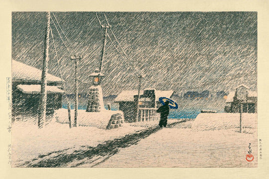 Hasui Kawase, conocido por sus paisajes atmosféricos, retrata magistralmente el aislamiento pacífico de Tsukishima bajo una manta de nieve. Su trabajo es renombrado por su emotivo uso del espacio y la luz, invitando a los espectadores a escenas tranquilas de la vida cotidiana en Japón. Esta pieza en particular tipifica su habilidad para representar la belleza silenciosa, casi etérea, de un paisaje nevado.