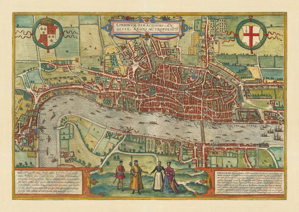 Mapa muy antiguo de Londres, 1572 de Georg Braun: City of London, Westminster, Southwark
