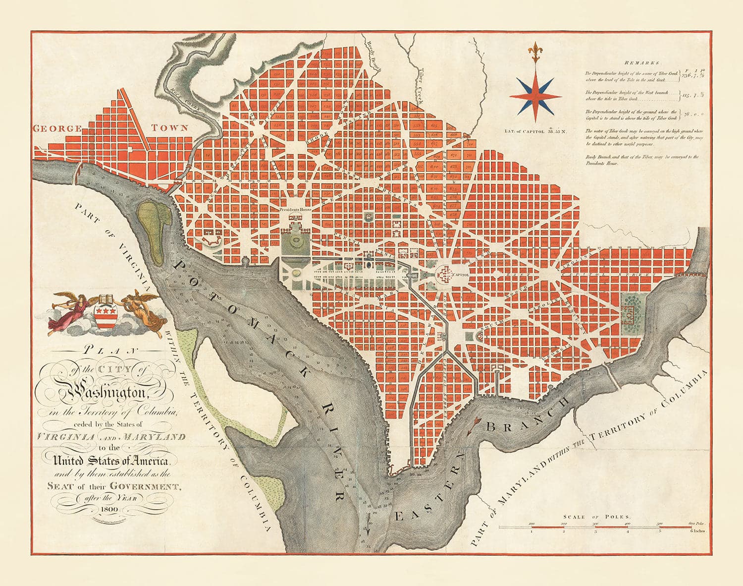 El primer plan de DC de la revés de DC se organizó en 1791, y los primeros planes oficiales se publicaron en 1792. Puedes ver que el diseño moderno de la ciudad está notablemente cerca del original, más a 220 -El plan antiguo.
