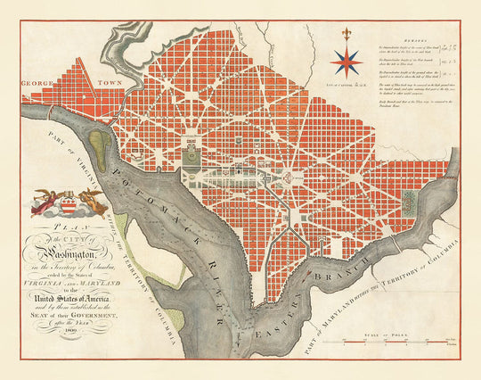 Mapa muy antiguo de Washington DC, 1795 de John Russell: Georgetown, Casa Blanca, Capitolio, Casa Blanca, Plan de la Ciudad