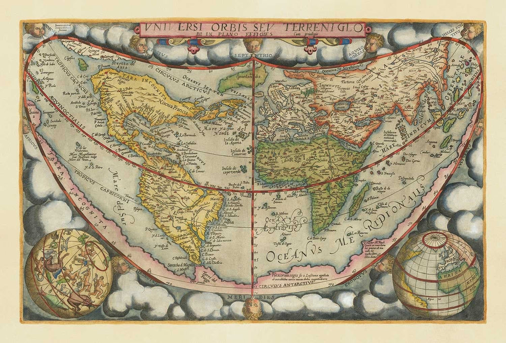 Este es uno de los primeros mapas que muestra América del Norte como una masa de tierra separada de Asia (aunque la costa norte es totalmente desconocida), y si miras de cerca puedes ver algunos de los primeros descubrimientos coloniales en el Atlántico y el Pacífico. La Antártida y la península de Tierra del Fuego cerca de la actual Argentina son completamente especulativas en este punto - y en esta proyección cordiforme, parecen envolver el mundo.