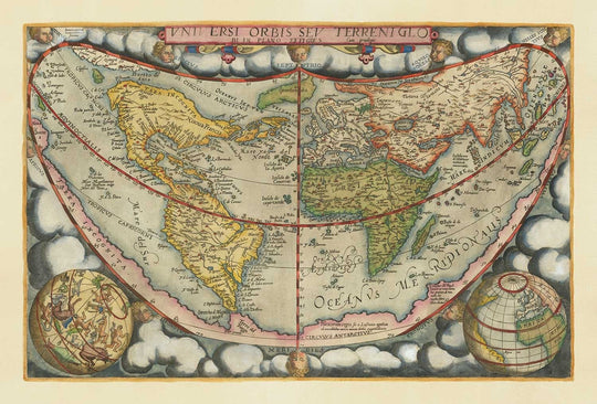 Mapa del mundo muy antiguo, 1571 por Gerard De Jode: Proyección cordiforme, Querubines, Antártida, Atlas, Colonialismo temprano