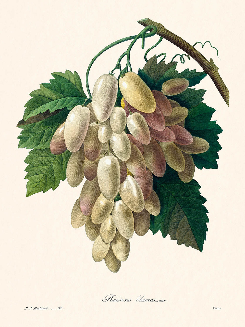 Ilustración botánica de uva blanca por Pierre-Joseph Redouté, 1827