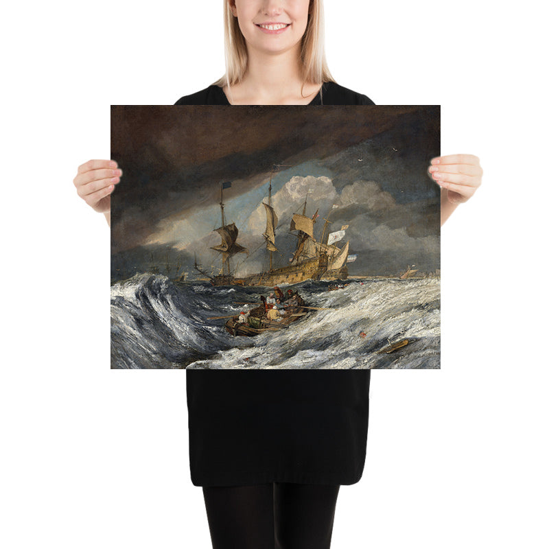 Boats Carrying Out Anchors to the Dutch Men of War by Joseph Mallord William Turner (1804) is a stirring Romantic seascape that captures the peril and poetry of life at sea. Turner, renowned for transforming light and atmosphere into living forces, shows small service boats battling heaving waters as they ferry heavy anchors to the waiting Dutch men-of-war. The drama unfolds under a brooding sky where light breaks through in fitful bursts, illuminating rigging, sails, and spray with an almost theatrical intensity—classic Turner, poised between observation and the sublime.