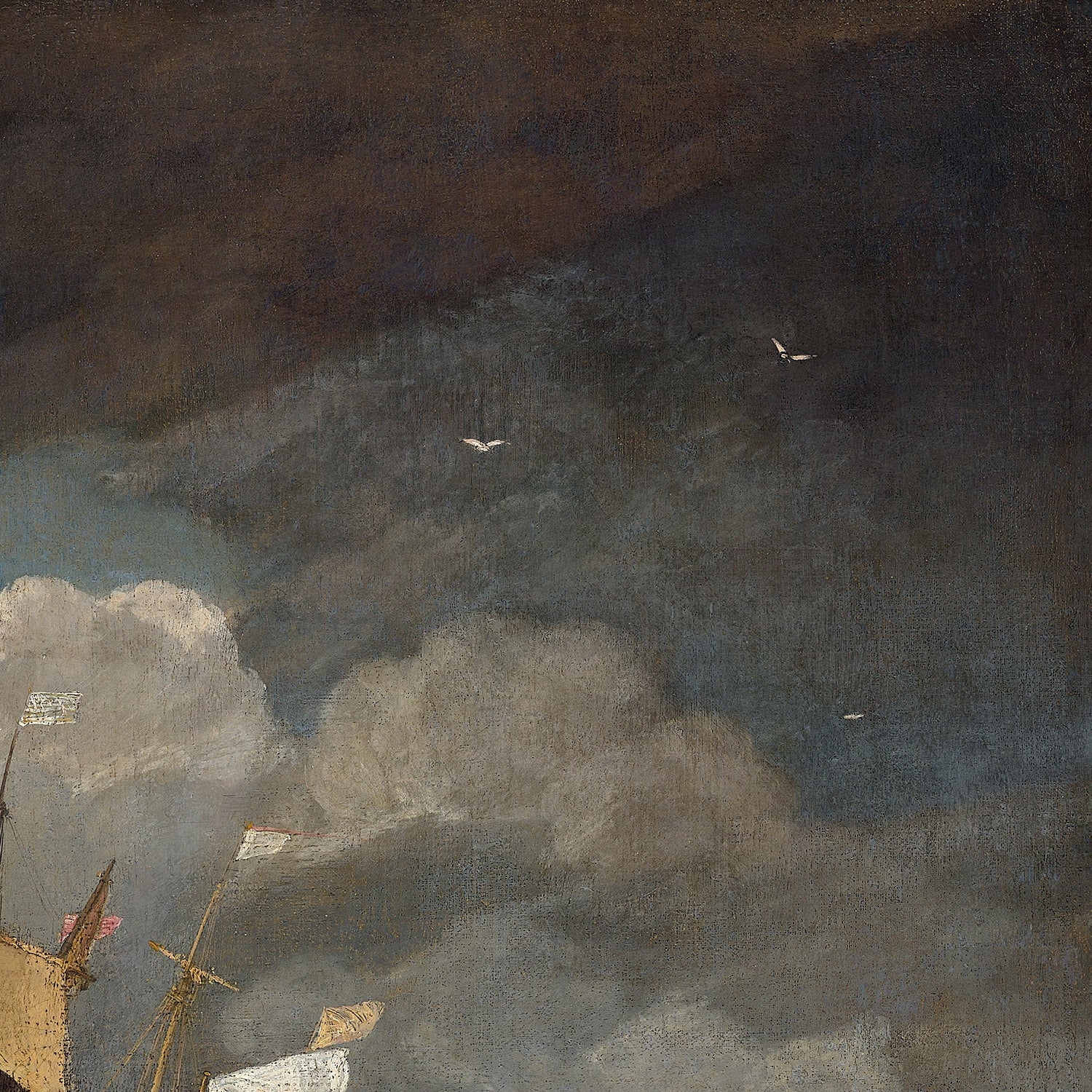 The palette here is led by smoky browns, golden-yellows, and luminous whites that flicker across sails, foam, and cloudbreaks. These warm notes are set against cooler, steely undertones in the water and sky, heightening the sense of oncoming weather. Bold, textured brushwork animates the waves, while taut lines of masts and rigging drive the eye through the composition. The result is not just a depiction of ships, but an orchestration of light, movement, and mood—an evocative statement piece for any collector of maritime art or admirer of Turner’s revolutionary vision.