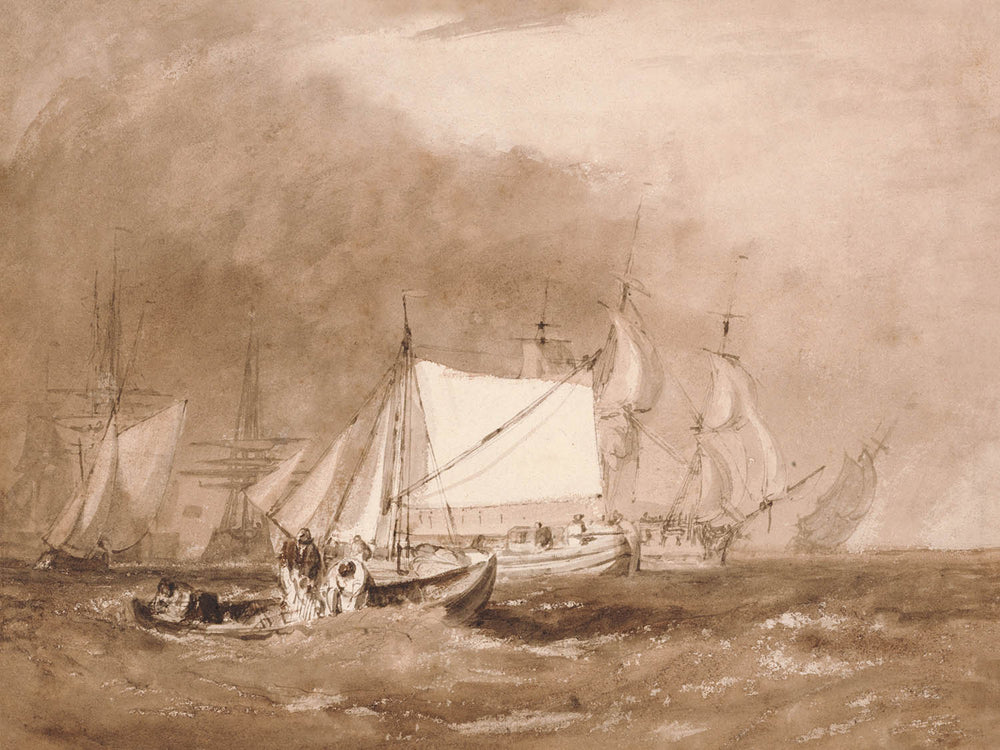 The artwork itself is notable for its dramatic exploration of marine coexistence—the juxtaposition of hardworking fishermen amidst towering merchant ships. Turner paints his canvas with dramatic browns that predominate the scene, evoking a sense of earthiness and lived-in realism, balanced by breathtaking passages of white that carve out light in the swirling sky and sea foam. Mists and textured sailcloth dissolve into dreamy taupes and creamy light, capturing both the serenity and turbulence of British waters.