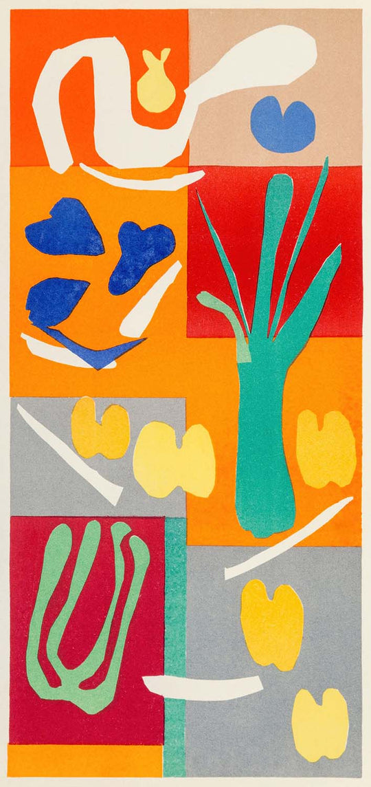 Como uno de los artistas más influyentes del siglo XX, Henri Matisse emergió como una figura destacada en el arte moderno. Conocido por su uso de color expresivo y formas innovadoras, su trabajo a menudo exploró temas de la naturaleza y la esencia de la vida. "Végétaux" ejemplifica esta exploración a través de sus formas orgánicas y exuberantes, enmarcadas por un fondo de verde vibrante, acentuado por rojos y naranjas.