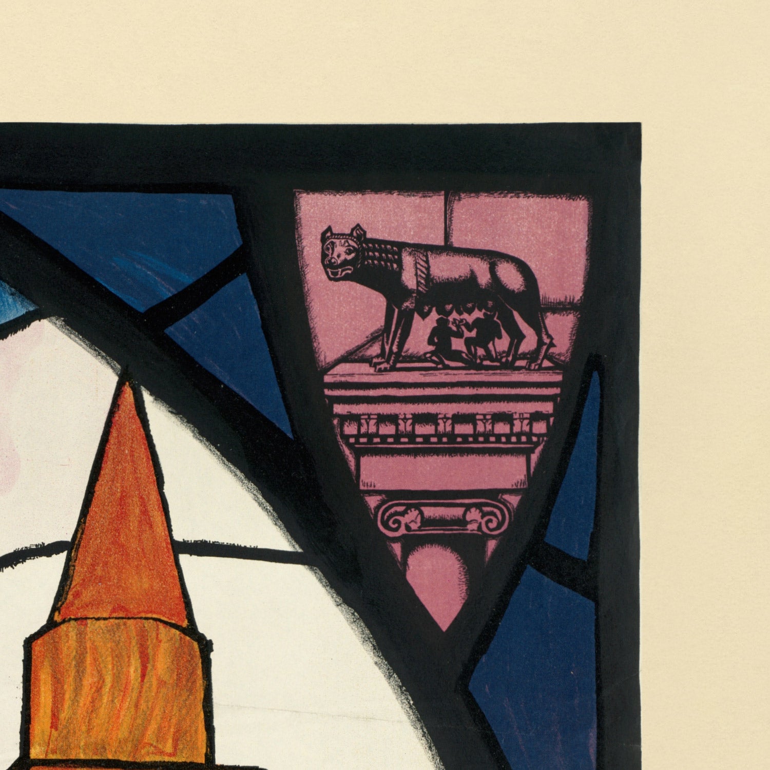Color, style, and why you’ll love it: Dominant orange and red tones glow like sunset against bands of cobalt and ultramarine, while heavy black “leading” outlines mimic ecclesiastical glass. The jeweled cross sparkles with small bursts of green and blue, and the monumental letterforms of AQUILEIA anchor the piece with Art Deco drama. This design is a striking accent for warm, modern interiors and a perfect companion to mid‑century furniture or contemporary minimalism—ideal for anyone who has wandered the basilica’s mosaic floor or explored the lagoon on the road to nearby Grado and Trieste.