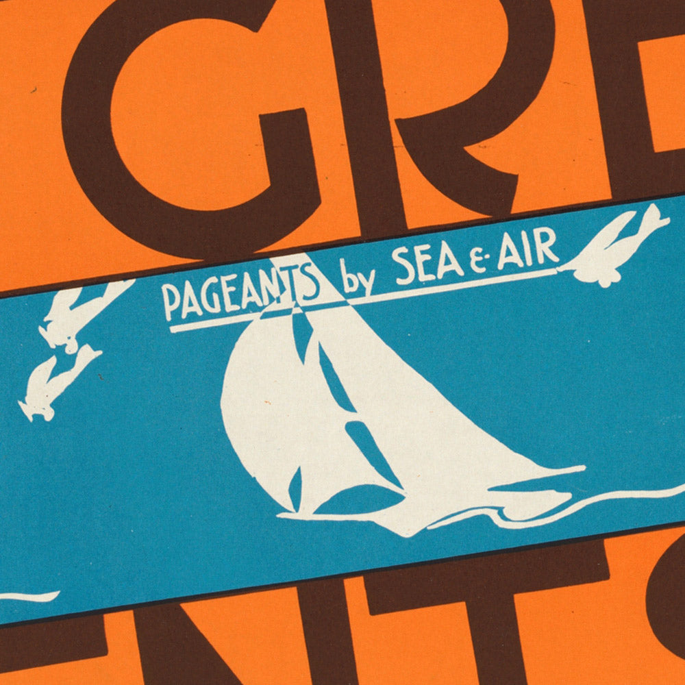 A carnival of great events!! South Australia centenary celebrations, designed by an anonymous commercial artist in 1936, captures the excitement of the State’s 1836–1936 centenary year. Issued by the State Centenary Executive Committee in Adelaide, it’s a classic Australian travel poster in a bold Art Deco style—made to entice visitors with a season of sport and spectacle. Slashed across a vivid orange ground, angled ribbons of green and ocean blue parade crisp white silhouettes of horse racing, cycling, sailing, and cricket, with playful banners that read “Pageants by Sea & Air” and “The Fight for the Ashes.”