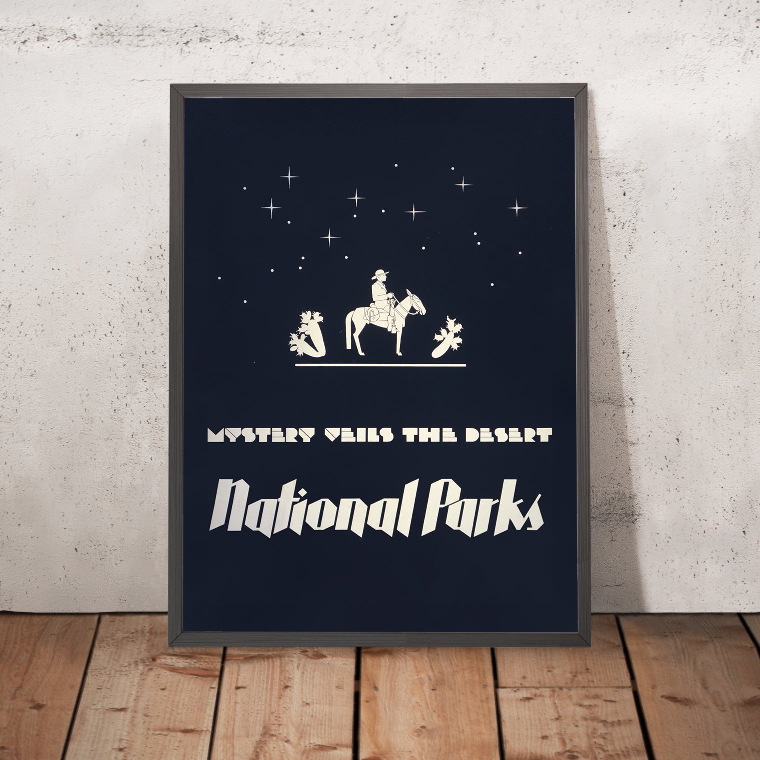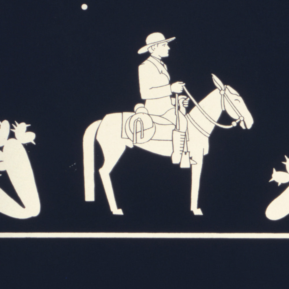 Visually, Waugh’s design is a masterclass in minimal means and maximum impact. A deep navy field anchors the composition, while white figures, typography, and stars strike a clean, modern contrast. The angular Art Deco lettering, simplified cacti, and purposeful silhouettes create a bold figure-ground relationship that reads instantly from across a room. The palette, dominated by blue and white, is versatile for interiors—equally striking above a mid-century credenza, beside natural wood, or in a crisp, contemporary gallery wall—making this a timeless piece to own.