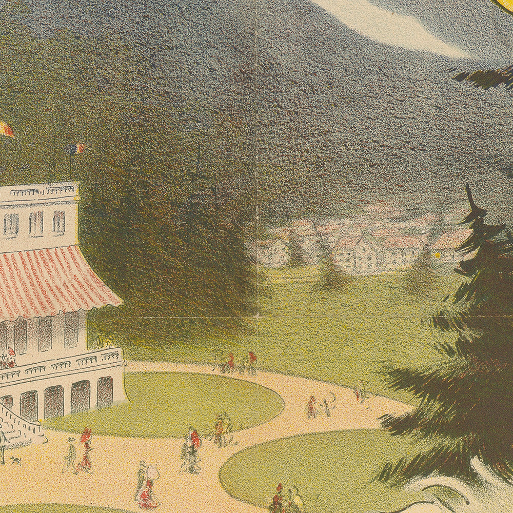 Chamonix, nestled in Haute-Savoie at the foot of Mont Blanc, was already a destination for mountaineers by 1905, but it was the broader culture of Alpine leisure—grand hotels, promenades, and, notably, the casino—that turned the valley into a cosmopolitan playground. Posters like this one were more than advertisements; they were aspirational windows inviting viewers to swap the city for clean air, glittering nights, and grand company. Displayed today, the piece evokes that early age of travel—steam trains, refined dress, and the thrill of arriving somewhere extraordinary.