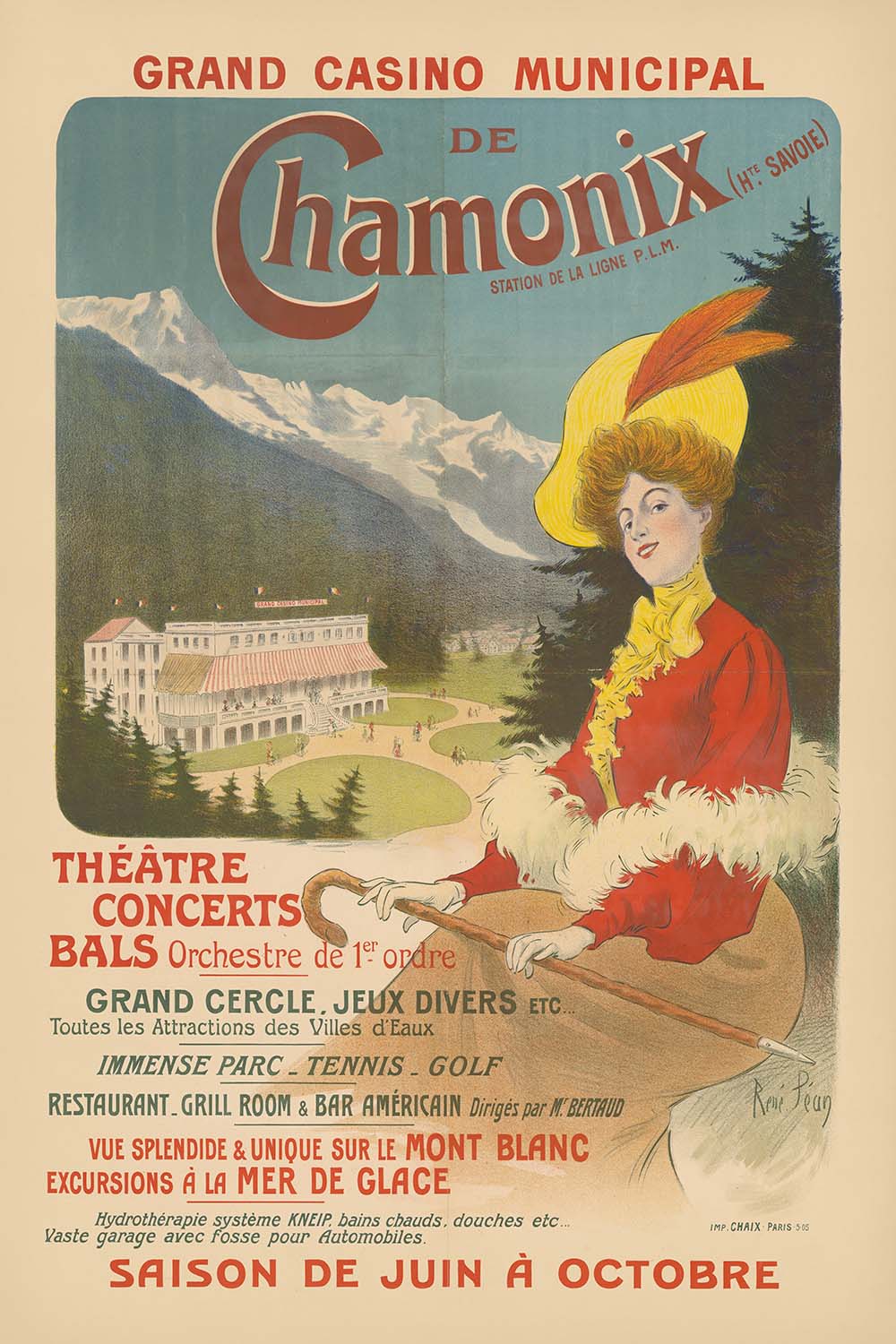 Grand Casino municipal de Chamonix by René Péan, created in 1905, captures the glittering allure of the Belle Époque in the shadow of Mont Blanc. Issued at a time when rail travel was opening the French Alps to fashionable tourists, this antique travel poster promotes Chamonix’s municipal casino—the social heart of the resort—where concerts, gaming, and soirées animated long summer evenings and snow-bright winter days. On the sheet, a sweep of crimson lettering crowns the composition against a creamy ground, with cool blue tones suggesting the Alpine horizon and mustard-yellow accents lending a warm, theatrical glow.