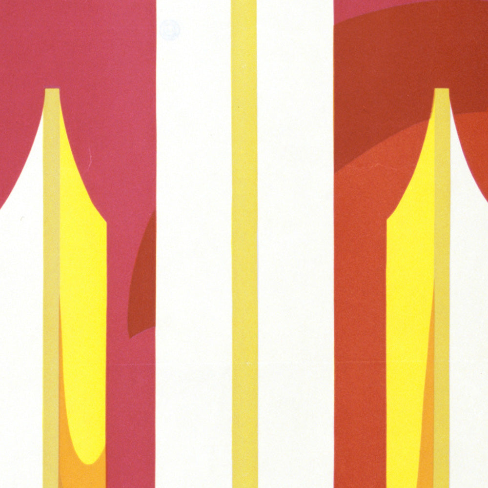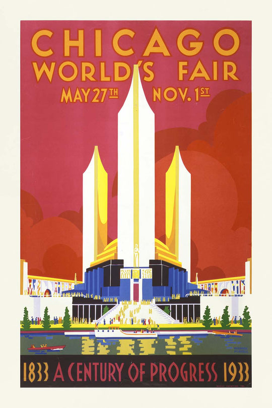 Chicago World’s Fair: A Century of Progress by Weimer Pursell (1933) celebrates the energy and optimism of Chicago at the height of the Art Deco era. Created for the city’s centennial exposition, the poster invites viewers to the lakefront fairgrounds with bold geometry and streamlined grandeur. In the composition, a radiant white-and-gold tower rises from a deep blue podium, flanked by symmetrical pylons and sweeping steps that guide the eye to a reflecting lagoon. Above, a saturated red sky with layered, circular cloud forms heightens the drama, while period lettering proclaims “CHICAGO WORLD’S FAIR — MAY 27TH — NOV. 1ST” and the centennial banner “1833 A CENTURY OF PROGRESS 1933.”