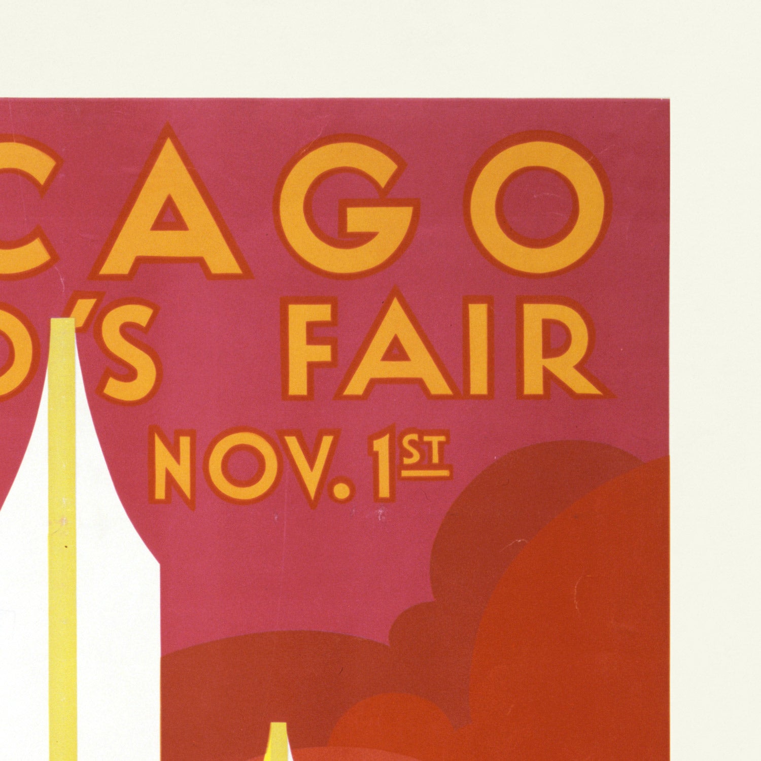 Why this print stands out: The palette—dominant reds offset by lemony yellows and richly saturated blues—creates a memorable Art Deco triad that reads beautifully on the wall. The poster’s geometry is impeccably balanced: the central tower’s glowing vertical thrust, the tiered staircases, and the mirrored lagoon form a rhythmic, architectural symmetry. The typography itself is a collectible feature, with faceted letterforms that echo the streamlined architecture. Displayed at scale, the work brings the glamour of 1930s poster design and a strong sense of place to any room—ideal for lovers of Chicago, architecture, and vintage design.