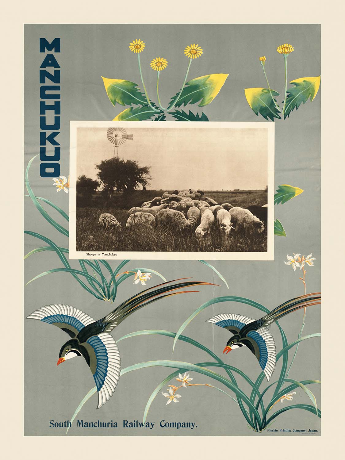 Design and color to love: The composition deftly contrasts a rectangular, sepia photograph with fluid, organic shapes—arching stems, fluttering birds, and floral motifs. A palette led by rich greens, radiant yellows, and deep blues (softened by elegant greys) produces a calm yet confident visual rhythm. Clean, Deco-inspired lines and the bold typography of “MANCHUKUO” and “South Manchuria Railway Company” enhance the poster’s modernity and collectible appeal. Hung in a living room, study, or hallway, it becomes a conversation piece—equally at home in vintage-inspired interiors or minimalist spaces that welcome a touch of history and color.