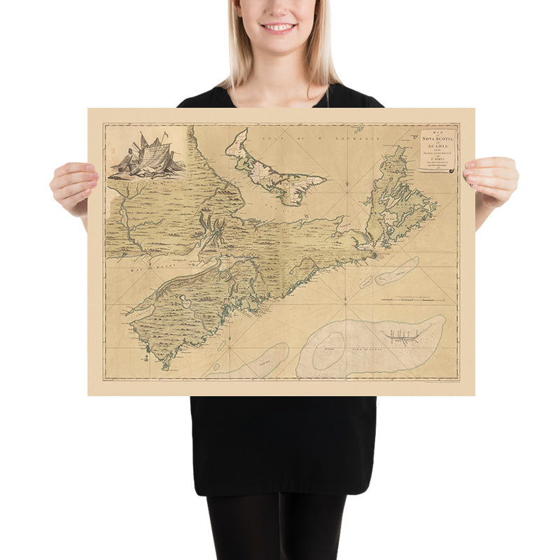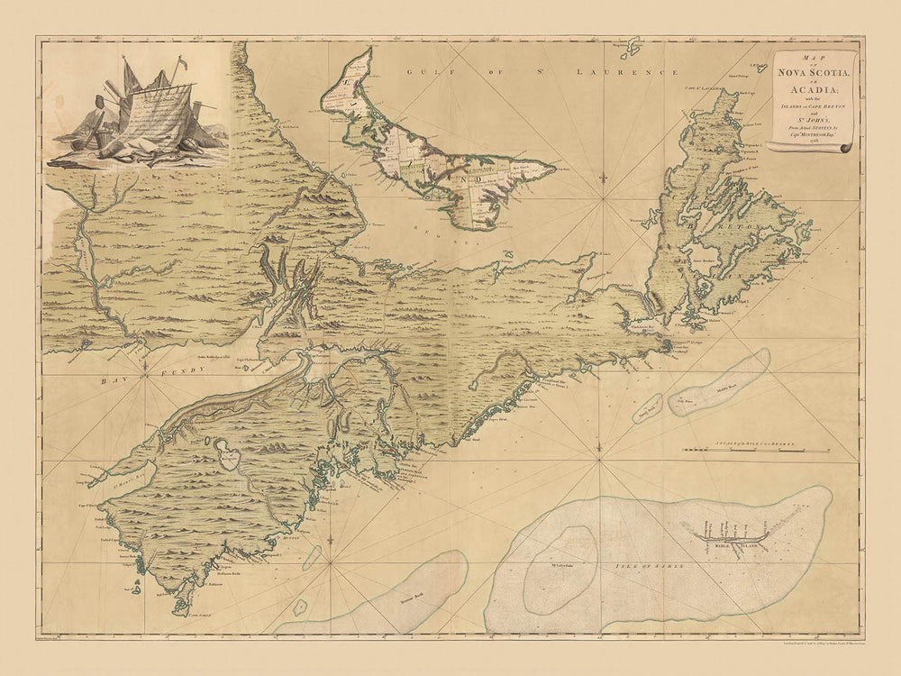 Old Nautical Map of Nova Scotia & PEI by Montresor, 1768: Halifax, Louisbourg, Cape Breton, Sable Island, Bay of Fundy