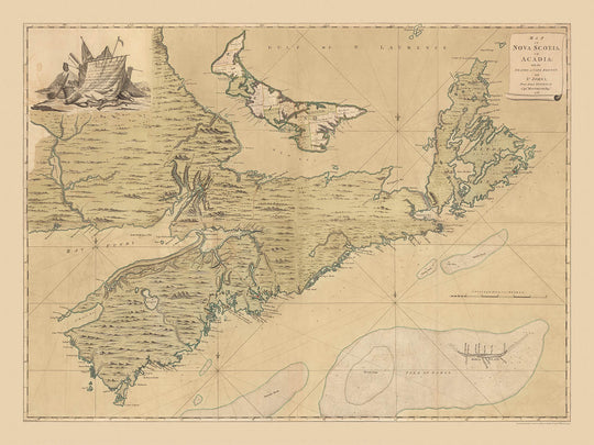 Map of Nova Scotia or Acadia with the Islands of Cape Breton and St. John’s, engraved in 1768, captures the British maritime frontier at a moment of decisive consolidation. Drawn by Captain John Montresor and issued in London by Andrew Dury, it surveys a coast newly pivotal after the French and Indian War. The chart spans the peninsulas and archipelagos of modern Nova Scotia, Cape Breton Island, and St. John’s Island (now Prince Edward Island), with the adjacent shores of present-day New Brunswick. Its purpose is unmistakable: to guide ships and soldiers alike. Coastal soundings, shoals, and promontories are rendered with exactitude, while inland hills and wooded relief cue the terrain beyond the harbors—an authoritative synthesis of geography and strategy composed for a newly ascendant empire.