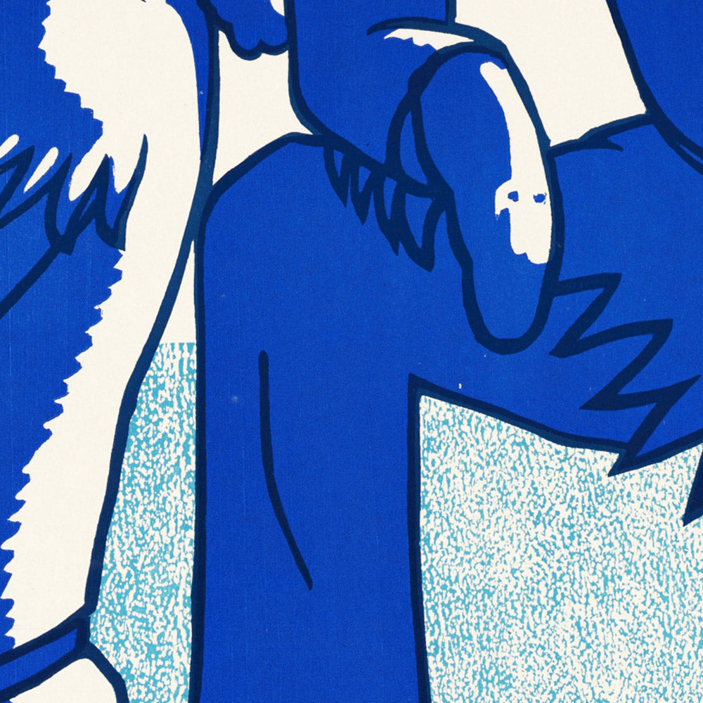 Design lovers will appreciate the Art Deco language throughout: geometric mountain planes, strong diagonals that convey momentum, and crisp outlines that read beautifully from across a room. The deep blues suggest distance and cool mountain air; reds add urgency and warmth; whites punctuate highlights and lettering for high contrast and immediate legibility. Flat color fields and restrained texture give the scene a striking graphic clarity—equally at home in minimalist, industrial, or vintage-inspired interiors.