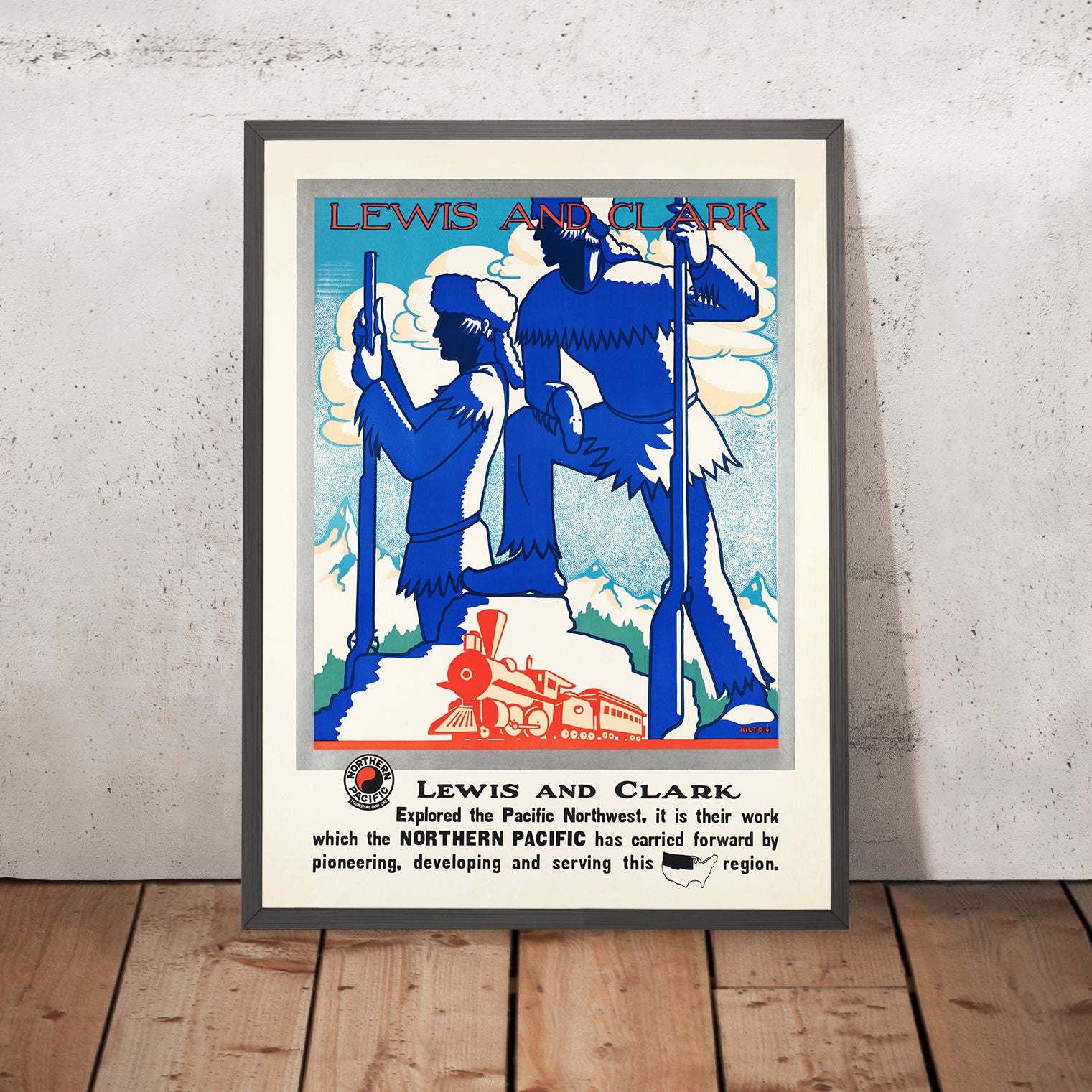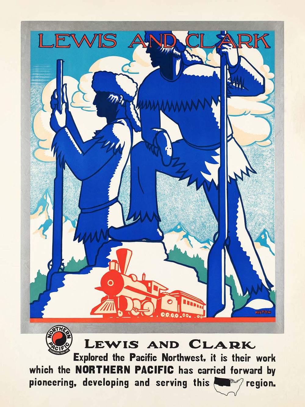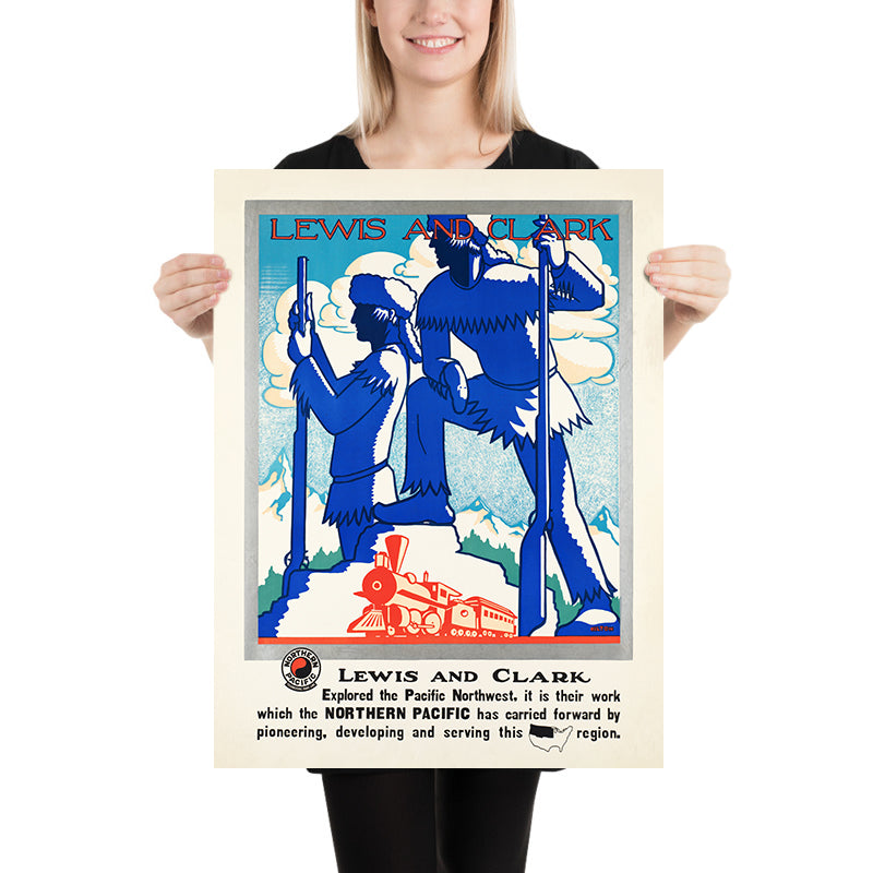 Lewis and Clark, an Art Deco-era travel poster created for the Northern Pacific Railway by an anonymous illustrator, channels the drama of America’s westward story into a bold, modern design. With heroic figures of the famed explorers set against faceted mountains, a gleaming steam locomotive, and a limited palette of deep blue, vivid red, and crisp white, the composition celebrates both the 19th‑century expedition and the 20th‑century age of rail. The poster’s theme points to the Pacific Northwest and Northern Plains—lands traced by the Lewis and Clark Trail—inviting viewers to imagine rugged horizons, winding rivers, and the thrill of discovery.