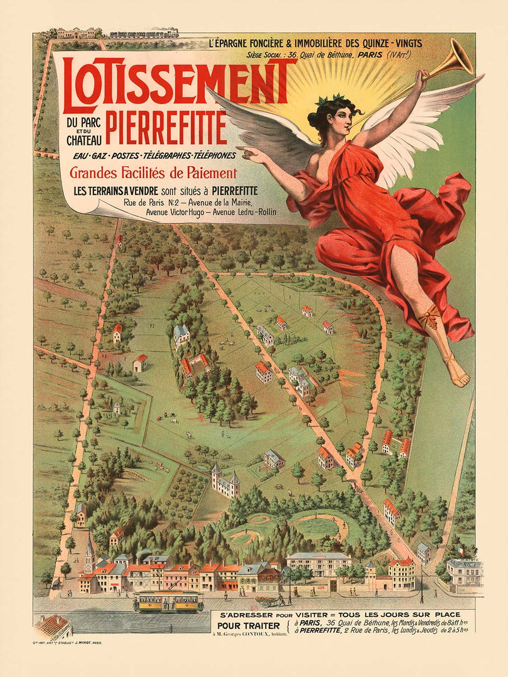 Lotissement du Parc et du Chateau Pierrefitte by Établissements Minot (1903) captures the optimism of the Belle Époque in a luminous vision of suburban Paris. Designed as an advertisement for a new residential development at Pierrefitte—just beyond the city’s historic limits—the poster blends allegory and modernity: a winged figure presides over a geometric patchwork of plots, streets, and gardens, suggesting prosperity, order, and growth. Bright greens, sun‑lit yellows, and confident reds carry the eye from the angel’s flowing drapery across neatly arrayed houses and tree‑lined avenues, a visual promise of fresh air, well‑planned streets, and a refined life within easy reach of the capital.