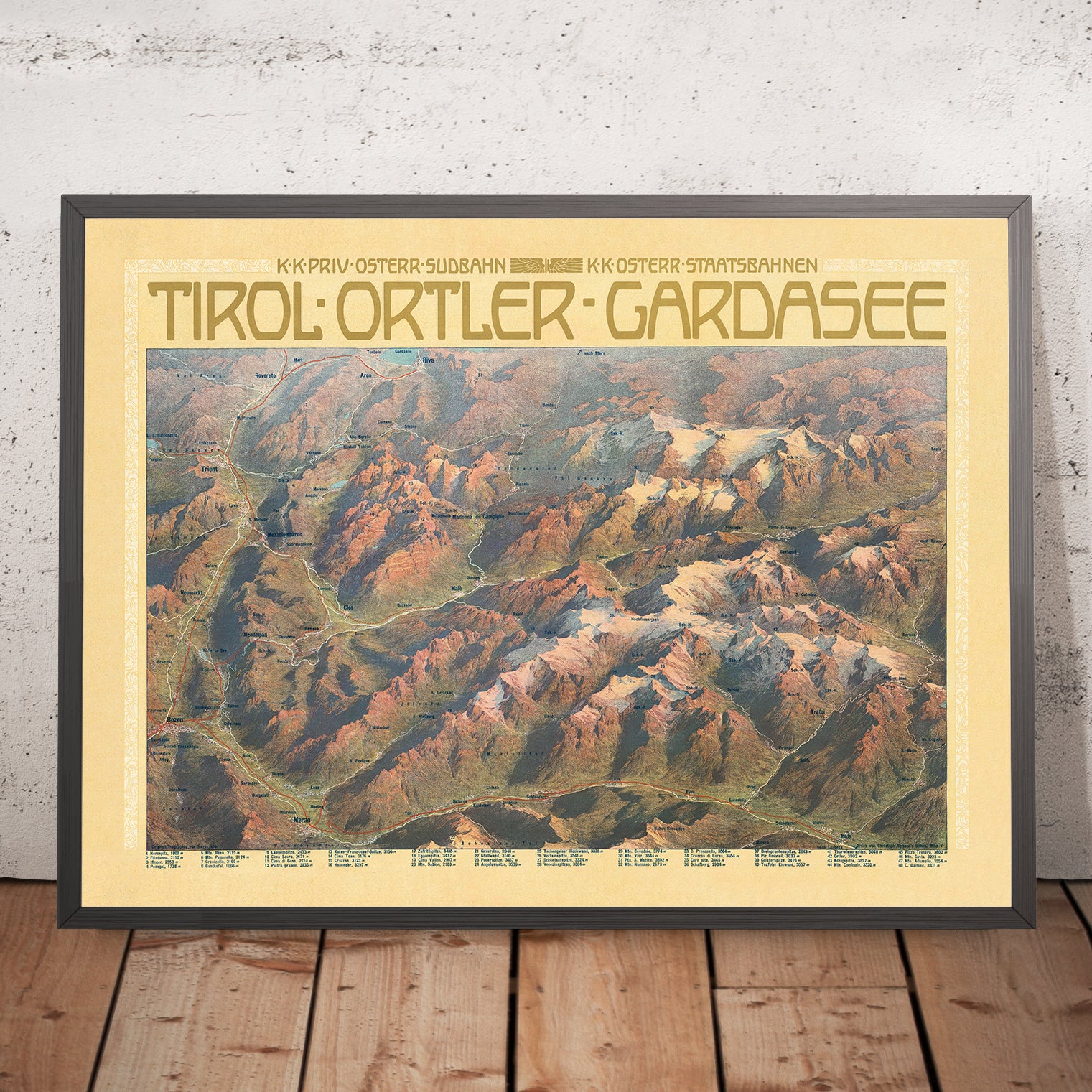 K. K. Priv. Österr. Südbahn. K.K. Österr. Staatsbahnen. Tyrol. Ortler. Gardasee, first published in 1908, is a sumptuous Alpine travel poster that blends cartography and art in the spirit of the Jugendstil era. Created for the Imperial-Royal Austrian Southern Railway and the Imperial-Royal Austrian State Railways, this decorative landscape map invites the viewer to trace the route from the Tyrol’s high country around the Ortler massif down toward the sunlit shores of Lake Garda. Its warm, earth-toned palette and elegant typography capture a moment when rail travel opened the Alps to modern tourism, promising grand scenery and effortless connection.
