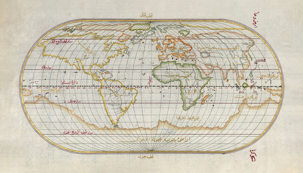 Un mapa ovalado muy detallado que muestra el mundo con escritura árabe muestra el mundo entero tal como se veía hace casi 500 años. La mayoría de los países están representados con precisión; sin embargo, la Antártida, las Indias Orientales y las Indias Occidentales no están tan bien documentadas hasta ahora.