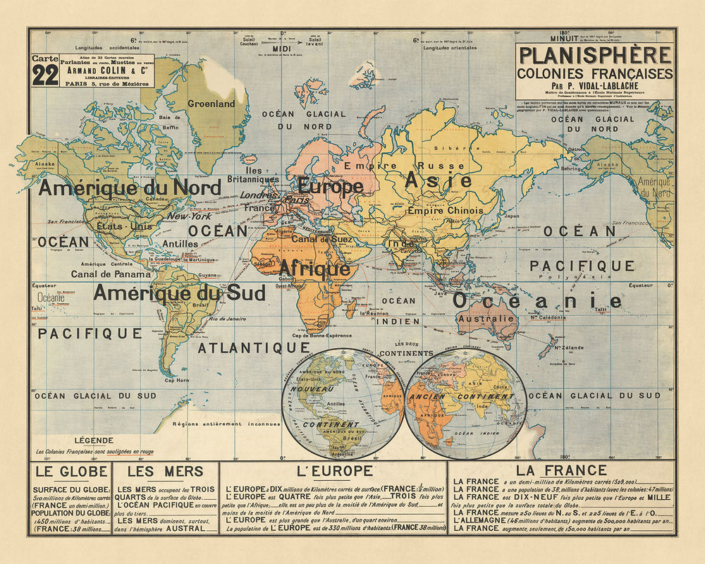 Embarca en un viaje a través del tiempo y el espacio con el exquisito "Planisferio" de Paul Vidal de La Blache, publicado por Armand Colin Editeur, una obra maestra creada en el corazón de París en 5, rue de Mezieres. Este mapa temático, un testimonio de la edad dorada de la exploración y la cartografía, captura el mundo de una manera que es tanto educativa como asombrosa. Diseñado con el propósito de iluminar mentes, el Planisferio sirve como una ventana a las vastas extensiones de nuestro planeta, mostrando la intrincada red de rutas marítimas, terrestres y ferroviarias que conectan tierras distantes. Desde los históricos Canales de Suez y Panamá hasta la legendaria ruta de Marsella a Yokohama, este mapa invita a los espectadores a trazar los caminos que han dado forma a la historia humana.