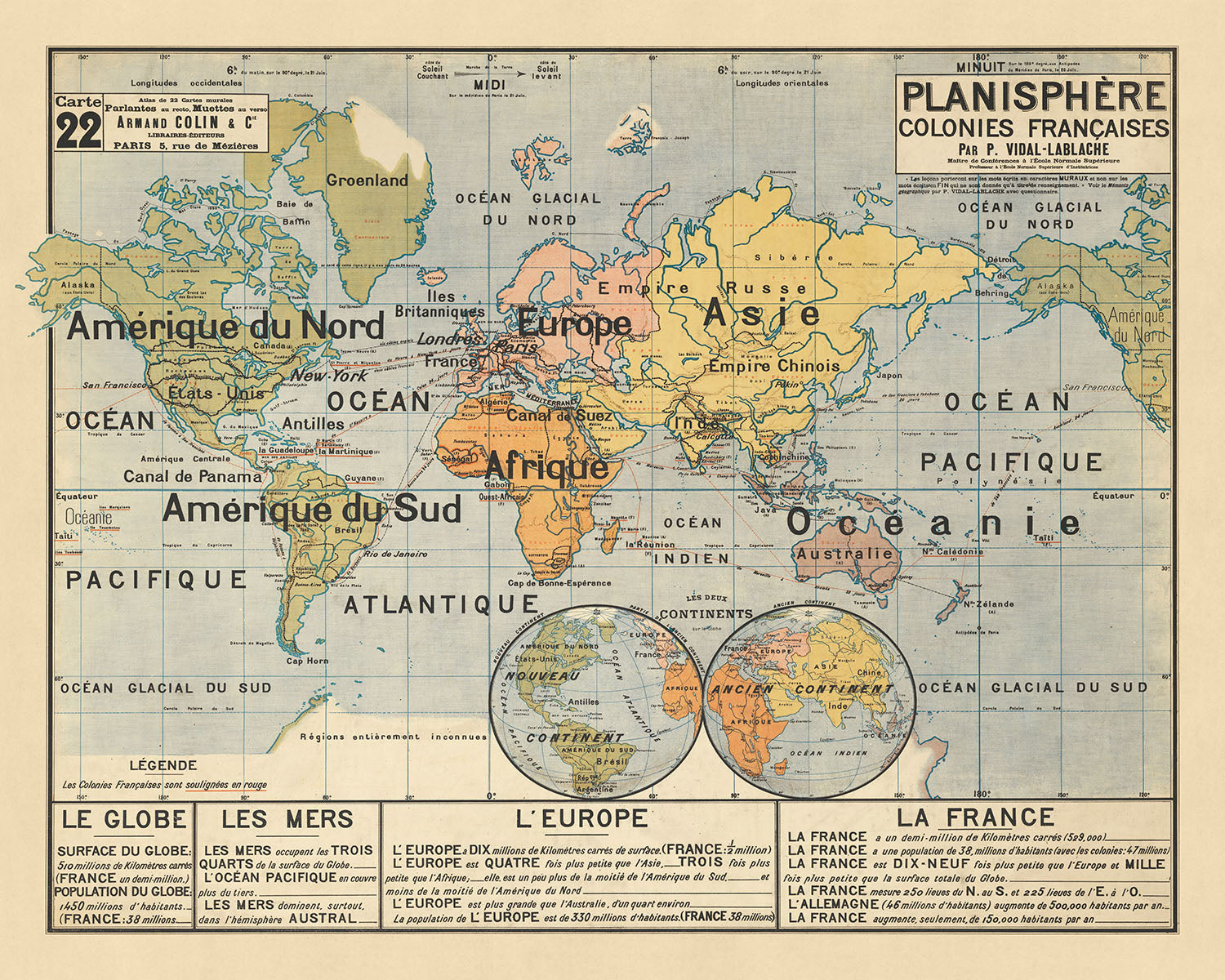 Mapa mundial colonial francés antiguo por Vidal Lablache, 1897: Gráfico educativo