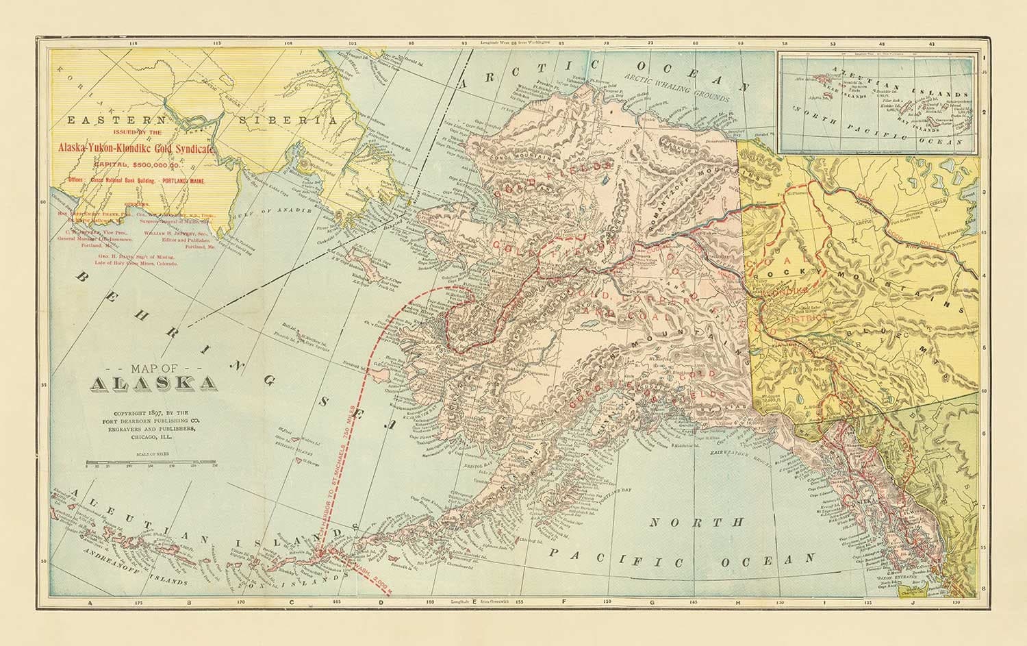 Publicado en 1897 por el Sindicato de Oro de Alaska-Yukon-Klondike de Portland, Maine, el propósito de este mapa fue asegurar la inversión de los inversionistas de los EE. UU., Para alimentar los esfuerzos del sindicato de extraer lotes y mucho oro.