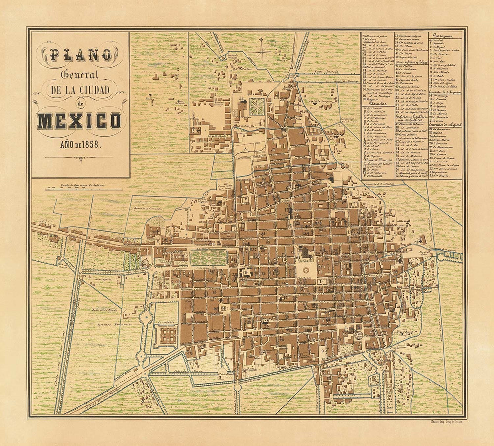 Mapa antiguo de la Ciudad de México, 1858: CDMX, Centro histórico, Centro, Catedral Metropolitana, Parque de Alameda