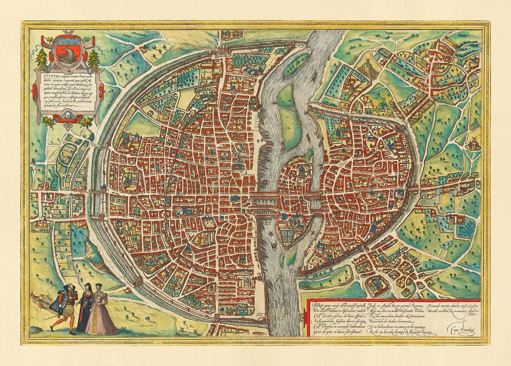 Publicado en 1572 por Georg Braun y Frans Hogenberg, este es el mapa completo y verdadero más antiguo de París. Si Shakespeare alguna vez visitó París, así es como se habría visto. Este mapa fue publicado por primera vez en Civitates Orbis Terrarum - las Ciudades del Mundo - que era una obra maestra cartográfica con 546 mapas.
