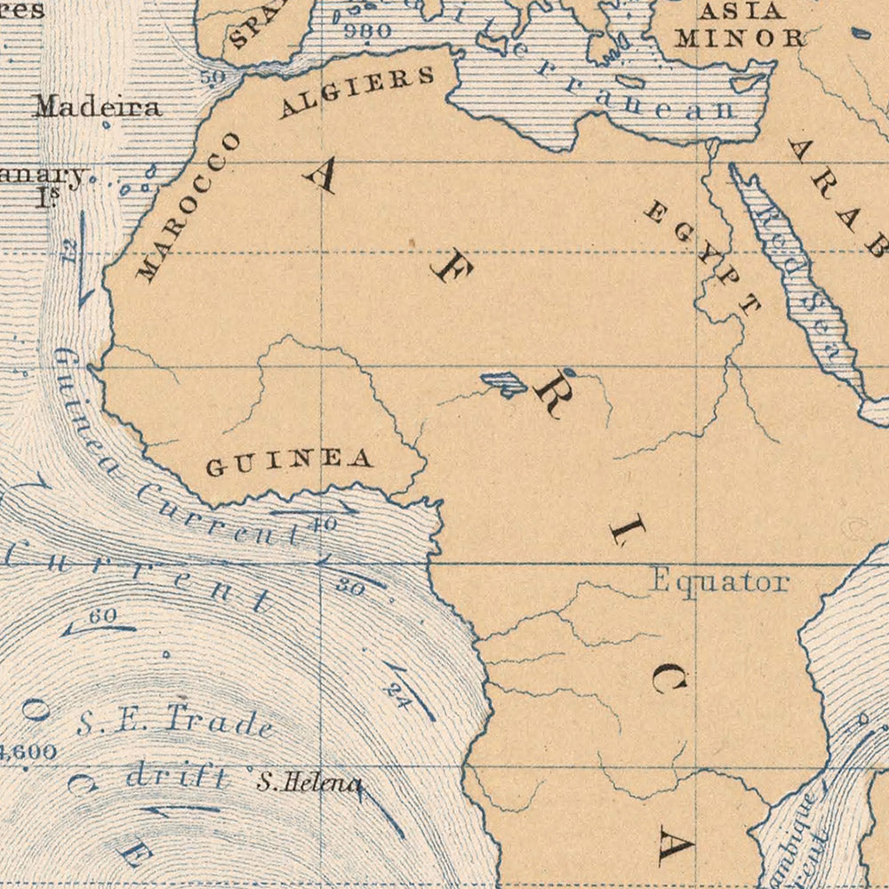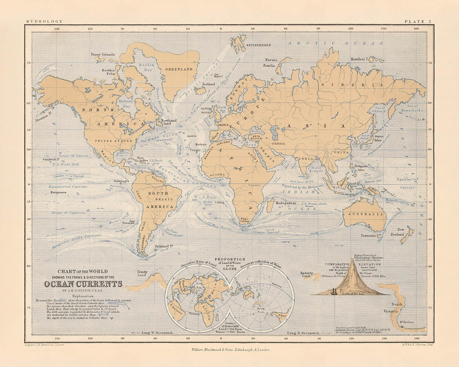 Issued at a moment when clipper ships chased seasonal winds and steam began to renegotiate ocean time, Johnston’s chart crystallizes the scientific turn of its age—sober, comparative, and global in scope. Published by Blackwood & Sons, whose presses carried the Physical Atlas into libraries and cabinets across Britain and beyond, it embodies the Victorian union of beauty and utility. Today, it reads as both an artifact of pioneering thematic cartography and an eerily modern system map: a graceful blueprint of the currents that still pattern our weather, steer our ships, and thread the continents together.