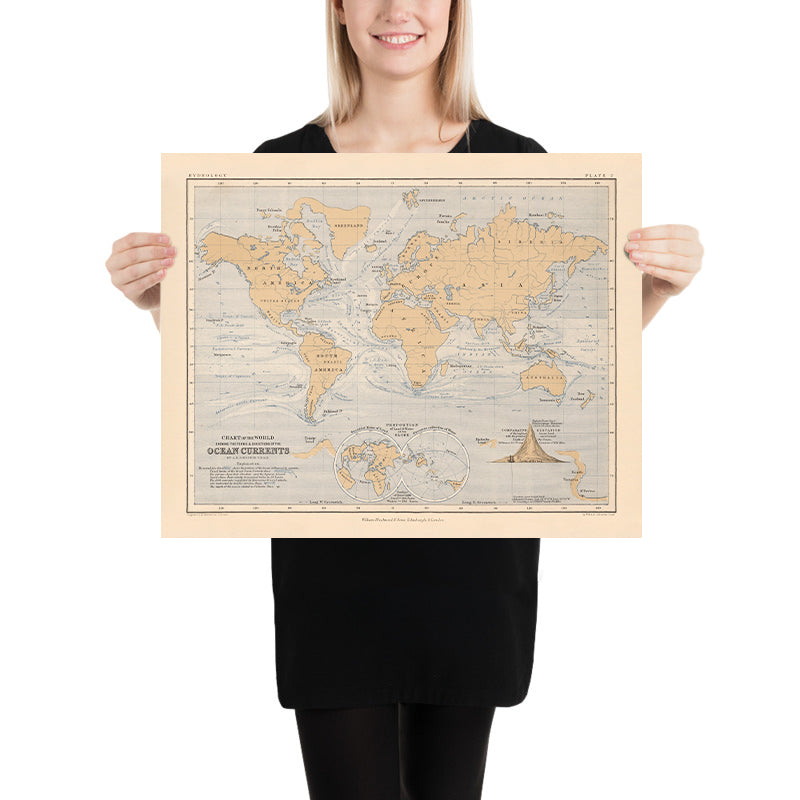 Chart of the World Showing the Forms and Directions of the Ocean Currents, engraved by Alexander Keith Johnston and issued in 1852 by William Blackwood & Sons of Edinburgh and London, distills the restless circulation of the seas into a masterwork of Victorian scientific cartography. Johnston—among the great popularizers of physical geography—transforms the globe into a legible system, where currents become the organizing principle for understanding climate, commerce, and exploration. The map’s didactic clarity reflects the mid‑19th century thirst for synthesis: it compiles the best contemporary observations into a single, authoritative planisphere that mariners, scholars, and curious readers could consult to grasp how invisible forces braid the Atlantic, Pacific, and Indian Oceans into one dynamic continuum.