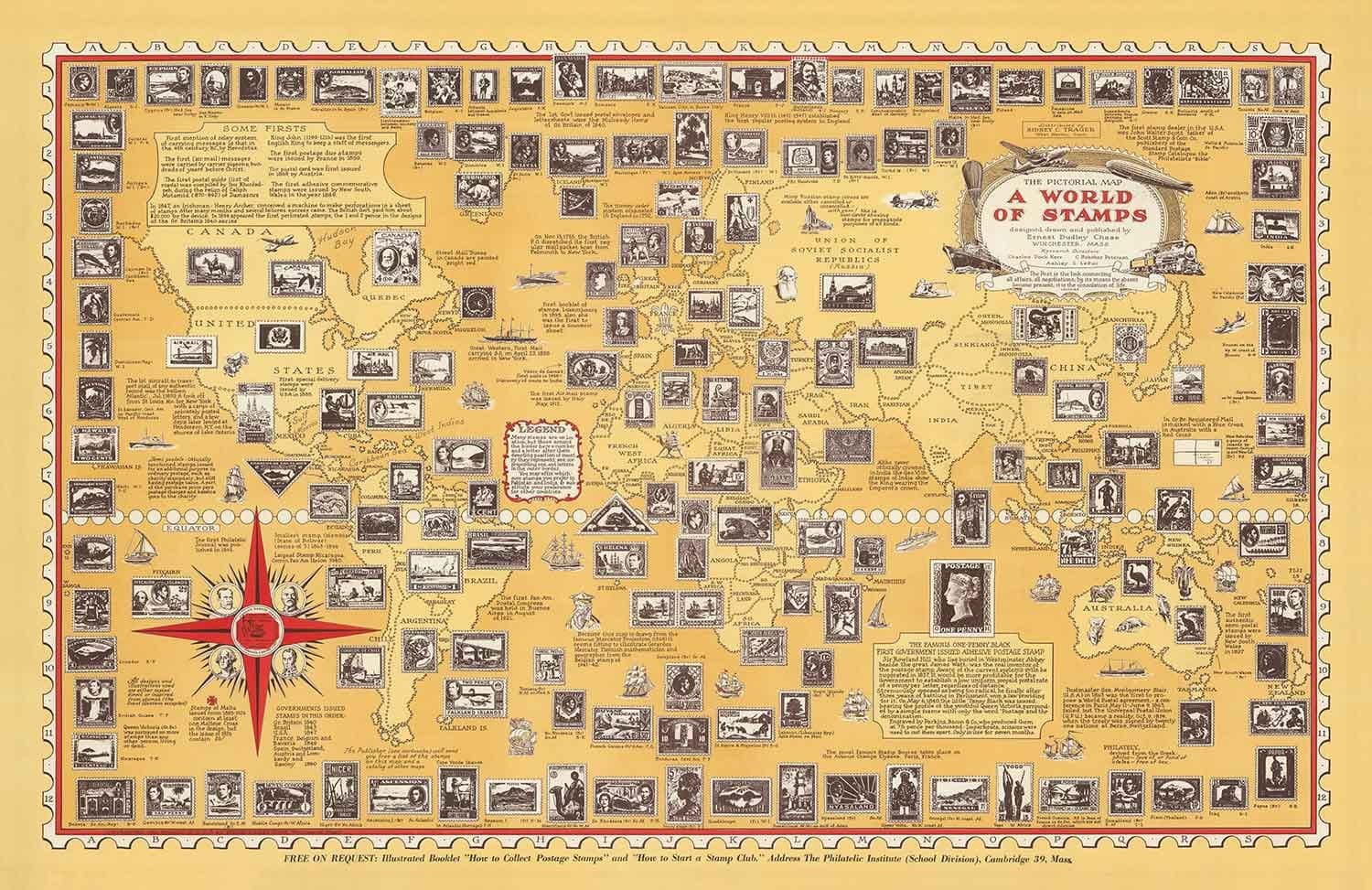Este mapa del mundo, bastante único, publicado originalmente por Ernest Dudley Chase en 1947, presenta docenas de ilustraciones altamente detalladas de sellos postales. Los sellos son predominantemente famosos, raros o significativos mapas de principios de 1900.