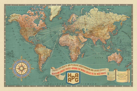 El diseño del mapa es a la vez funcional y estéticamente agradable, y presenta una representación a gran escala del mundo con una rosa de los vientos decorativa y una pancarta en la base que anuncia cruceros de salud. La paleta de colores vintage, típica de los mapas de principios del siglo XX, aumenta su encanto y atractivo. La inclusión de importantes cadenas montañosas como las Montañas Rocosas, los Andes, el Himalaya y los Alpes, así como cuerpos de agua prominentes como los océanos Atlántico, Pacífico, Índico, Ártico y Austral, proporciona una descripción completa y visualmente atractiva de la geografía de la Tierra. .