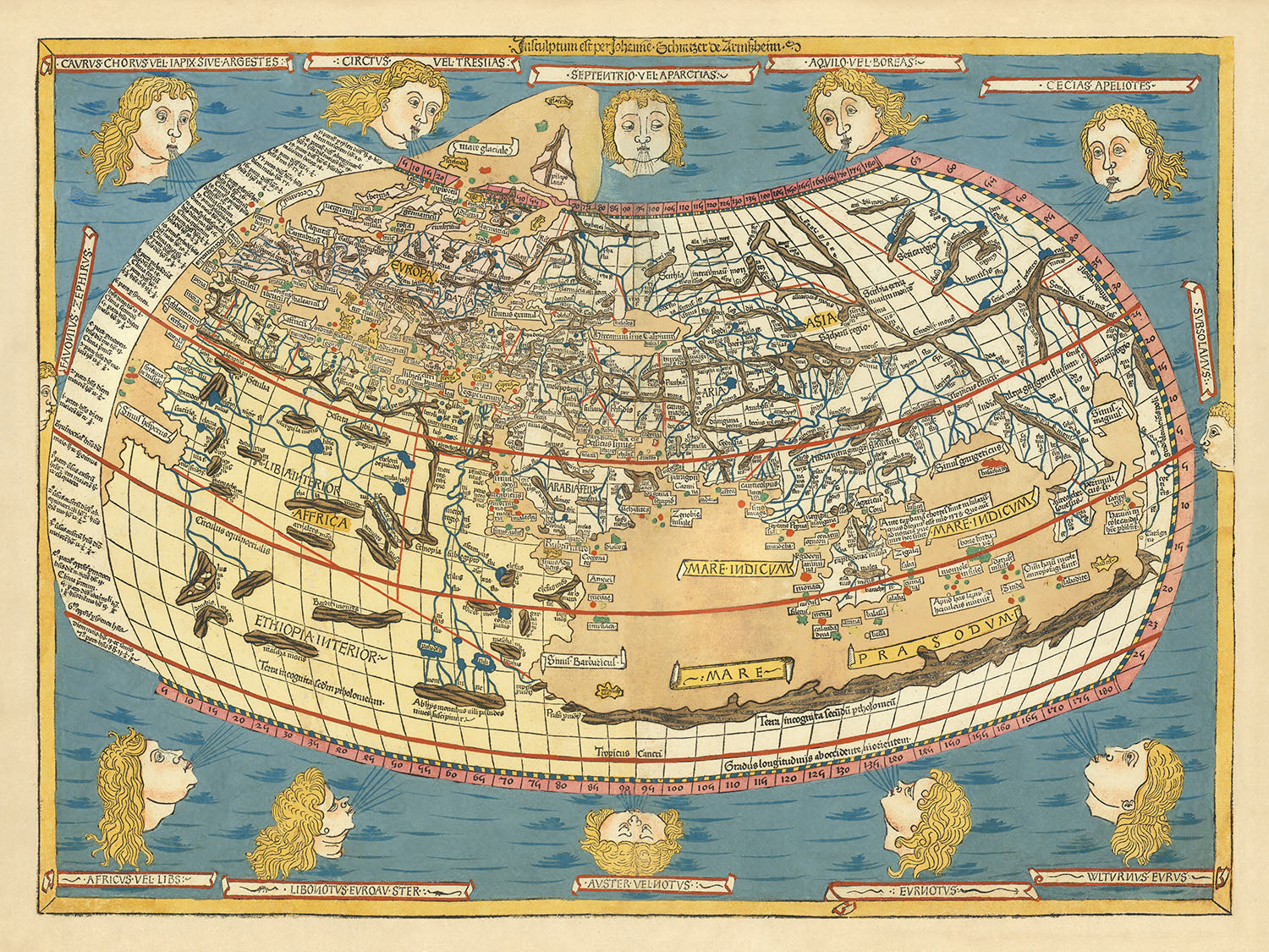 Este mapa del mundo de Ulm Ptolomeo, publicado en 1486, es quizás el más famoso y buscado de todos los mapas del mundo del siglo XV y, sin duda, el más decorativo. Es el primer mapa del mundo impreso al norte de los Alpes y el primero que aparece en color aplicado por el editor. Los mapas de la edición de Ulm son grabados en bloques de madera, no grabados en cobre, y este es también el mapa mundial más antiguo firmado por su grabadora, Johanne Schnitzer.