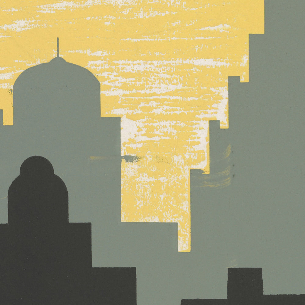 The artwork itself is notable for its lively use of color, dominated by a radiant yellow background that exudes warmth and energy. Deep reds and bold blacks create a sense of structure and motion, framing stylized figures and architectural motifs that evoke the city’s skyline and bustling art scene. The dynamic arrangement of geometric shapes and the interplay of light and shadow make this piece a visually captivating example of mid-century American poster art—ideal for collectors and design enthusiasts alike.