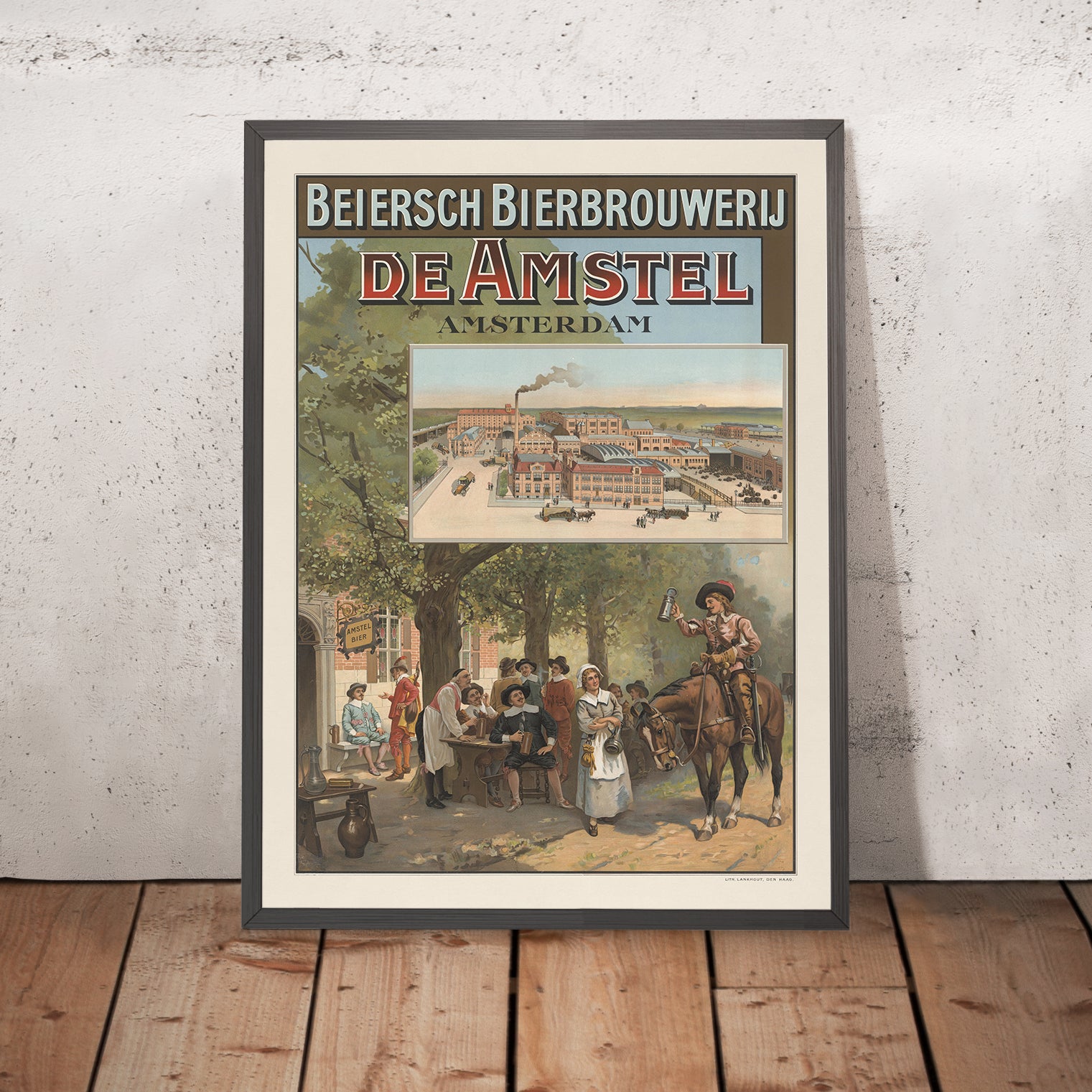 Beiersch Bierbrouwerij De Amstel Amsterdam is a handsome early-20th-century advertising poster from Amsterdam, celebrating the city’s famed Amstel Brewery. Created circa 1910 by a commercial poster artist working for the brewery, it embodies the era when Dutch makers embraced Bavarian “Beiersch” lager and broadcast their cosmopolitan confidence through bold, export-ready graphics. Rooted in the city that shares its name with the River Amstel, the brewery’s identity became a shorthand for Amsterdam’s industrious spirit and convivial café culture.