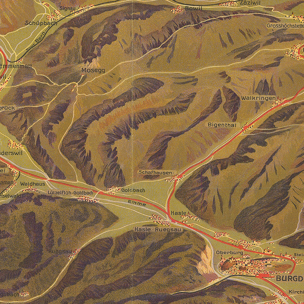 Burgdorf-Thun-Bahn – Emmenthal-Bahn – Solothurn-Münster-Bahn by Anton Reckziegel (1908) is a glorious, bird’s‑eye travel poster of the Bernese Mittelland. Reckziegel renders the Emmental’s folded hills and the climb over the Weissenstein with painterly relief, while the great Alpine wall punctuates the horizon—clearly labeled Eiger, Mönch, Jungfrau, Breithorn and Blümlisalp. A red line of steel threads through towns and valleys—THUN at the top edge, BURGDORF mid‑map, and SOLOTHURN near the Aare—while an inset at left shows a woman in traditional Bernese dress knitting on a bench, anchoring the grand panorama in everyday Swiss life.