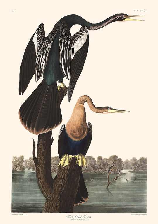 El Darter de vientre negro (Anhinga anhinga) es fascinante no solo por su importancia ecológica, sino también por su estética impactante, como se representa en la ilustración de Audubon. Los ricos colores y la pose realista del pájaro contra un fondo sereno hacen de esta obra de arte un deleite visual, demostrando la experiencia de Audubon en combinar precisión científica con belleza artística.