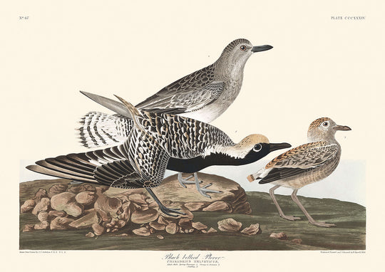 El "Chorlito de vientre negro (Placa 334)" de John James Audubon, publicado por primera vez en 1827, es una impresionante ilustración de la renombrada serie de Audubon, Las Aves de América. Este exquisito estudio de aves captura la belleza y esencia del Chorlito de vientre negro en su hábitat natural.